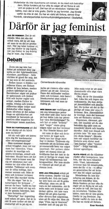 Okej, du är för jämställdhet. Lika lön och ingen ska trakasseras. Du kan skilja på jämställdhet och jämlikhet. Du tycker att det är förjävligt att män slår sina (!) kvinnor. Bra. Jämställdhet är trevligt, men det kommer inte att förändra världen. Feminism, däremot, gör ont. Det innebär att du ska betrakta dig själv som en misstänkt skurk och handla därefter. Håll tyst ibland och grymta inte "får man inte ens skoja längre". Skratta inte när någon berättar en historia som slutar med "jasi karlar" eller "typiskt tjejer" - fråga vad folk menar egentligen. Sluta påstå att du tillsätter chefer efter kompetens, inte kön, när du bara tillsätter män. Visst, inkvoterade kvinnor kan bli misstrodda, men det får vi ta - vi offrar en generation för att kvinnor ska bli något normalt.